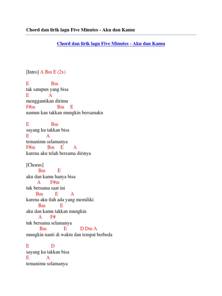 Chord Dan Lirik Lagu Five Minutes Aku Dan Kamu - Mungkin saja rasa itu telah pergi.